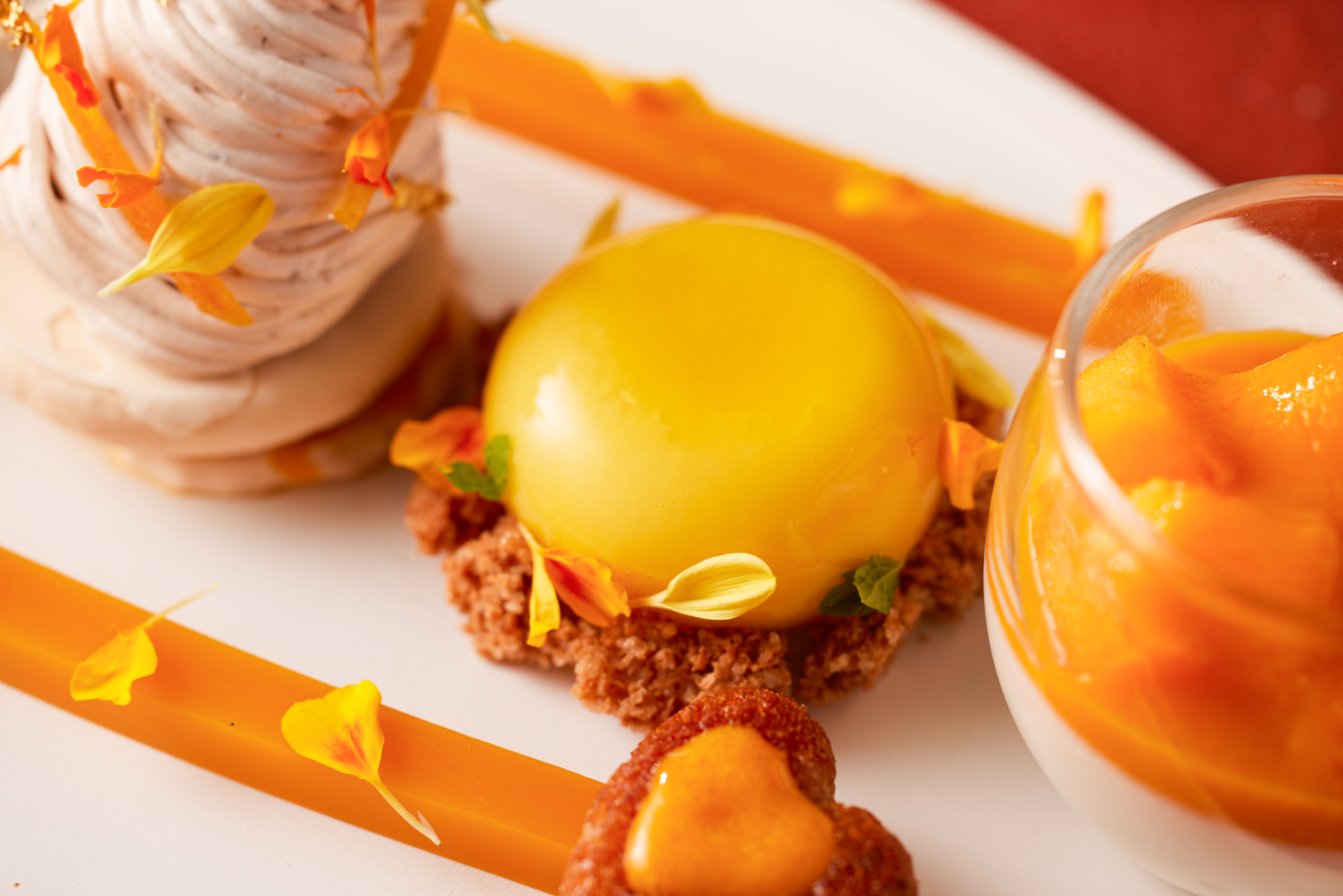 プラリネムースに杏とマンゴーを忍ばせ、オレンジのグラサージュで艶やかに仕立てた爽やかなムース。