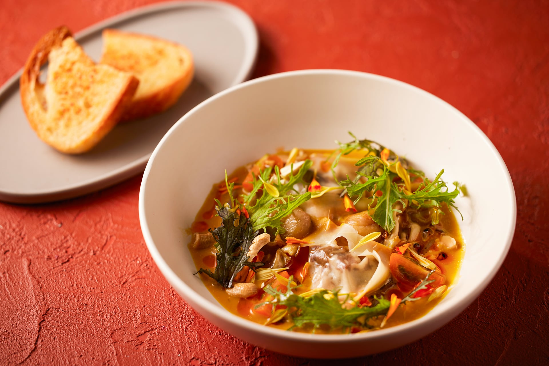 マッシュルームのダンプリングを、レモングラス香るかぼちゃスープで仕立てた秋らしい温かな一皿。