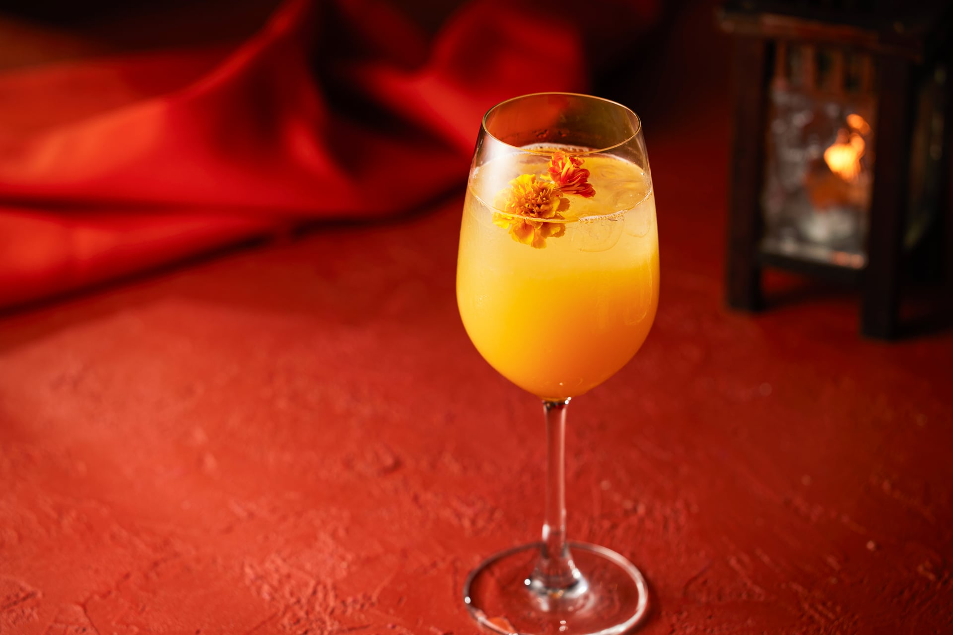 オレンジやマンゴー、パッションフルーツを合わせた爽やかなドリンク。黄金色のグラスに花を浮かべ、炭酸の泡が煌めく一杯。