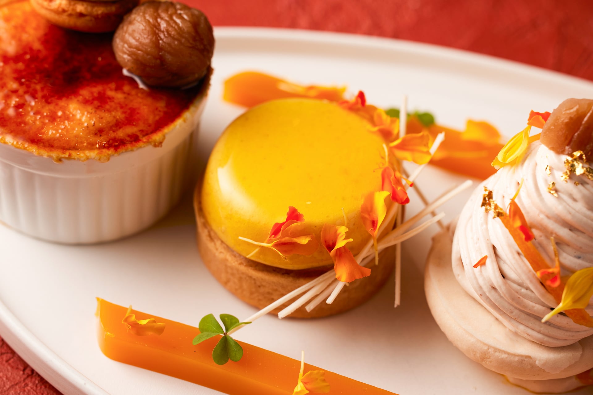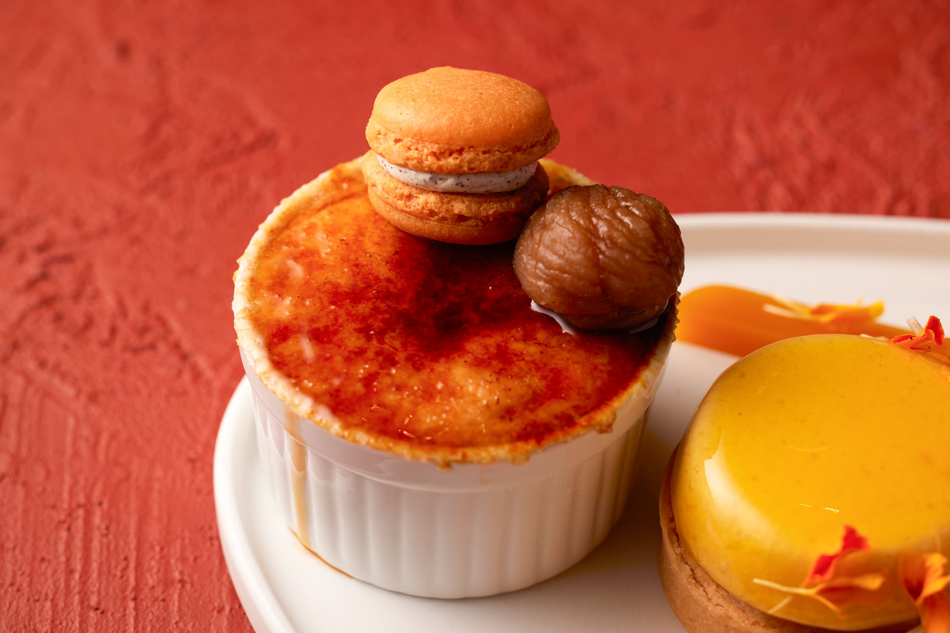 ジャスミン茶香るブリュレをオーガニックシュガーでキャラメリゼ。栗のマカロンを添えて華やかに仕上げた、秋らしい彩りが目を惹く一品。