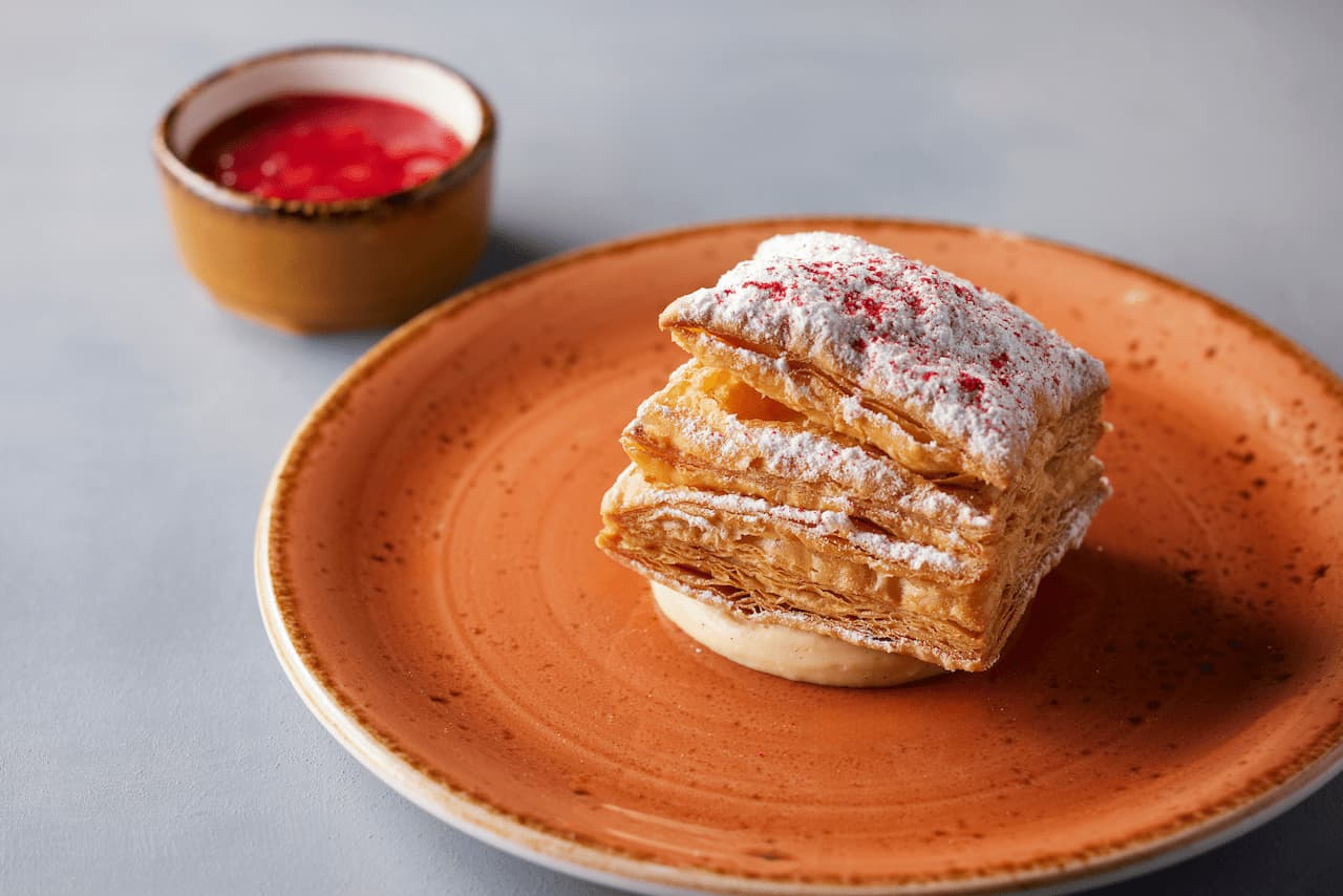 サクサクのパイにバニラ香る濃厚なアイスクリームを合わせ、旬の苺を使用したソースが彩りを添える甘く華やかな冬のデザートに仕上げました。