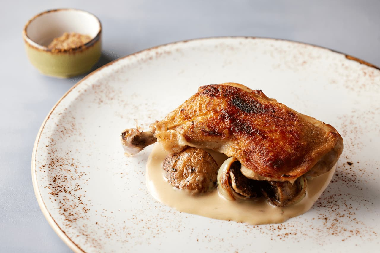 ほろりとほどける国産鶏の骨付きもも肉のコンフィに、濃厚なクリームベースのソースシュープレームと季節野菜を添えた、冬のご馳走メインディッシュ。