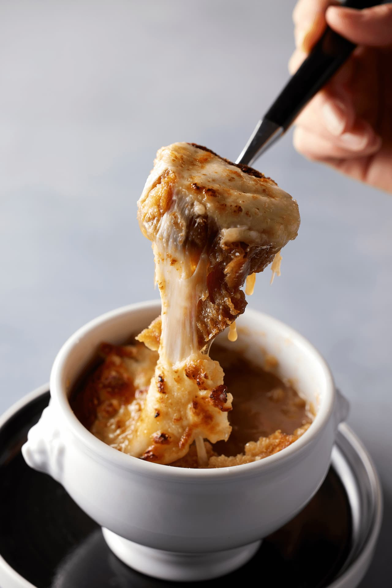 飴色になるまで五時間かけて炒めた玉ねぎは深い甘味を持ち、香ばしいチーズと共にお召し上がりいただくことで、身体から心までじんわりと温まるスープに仕上げました。