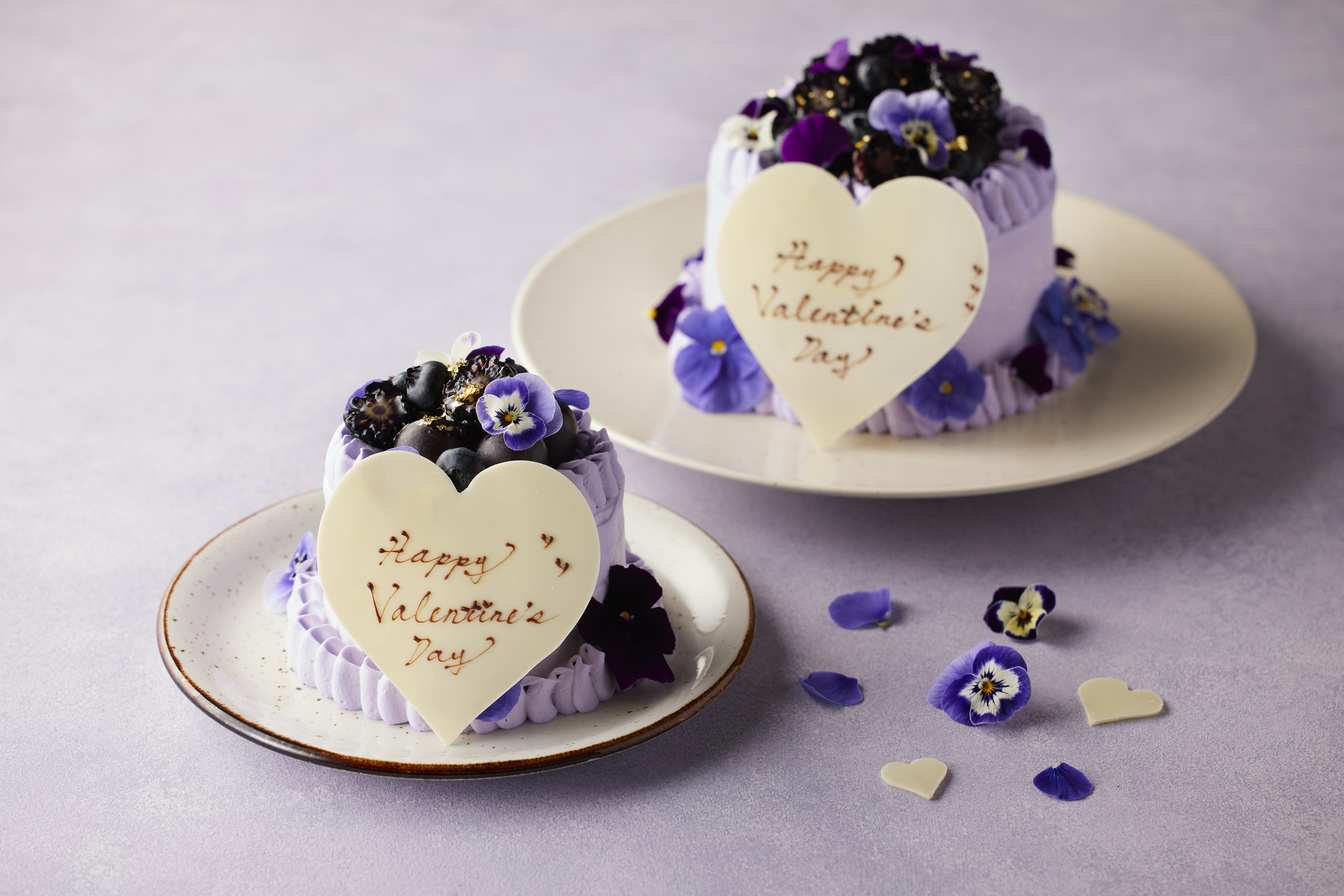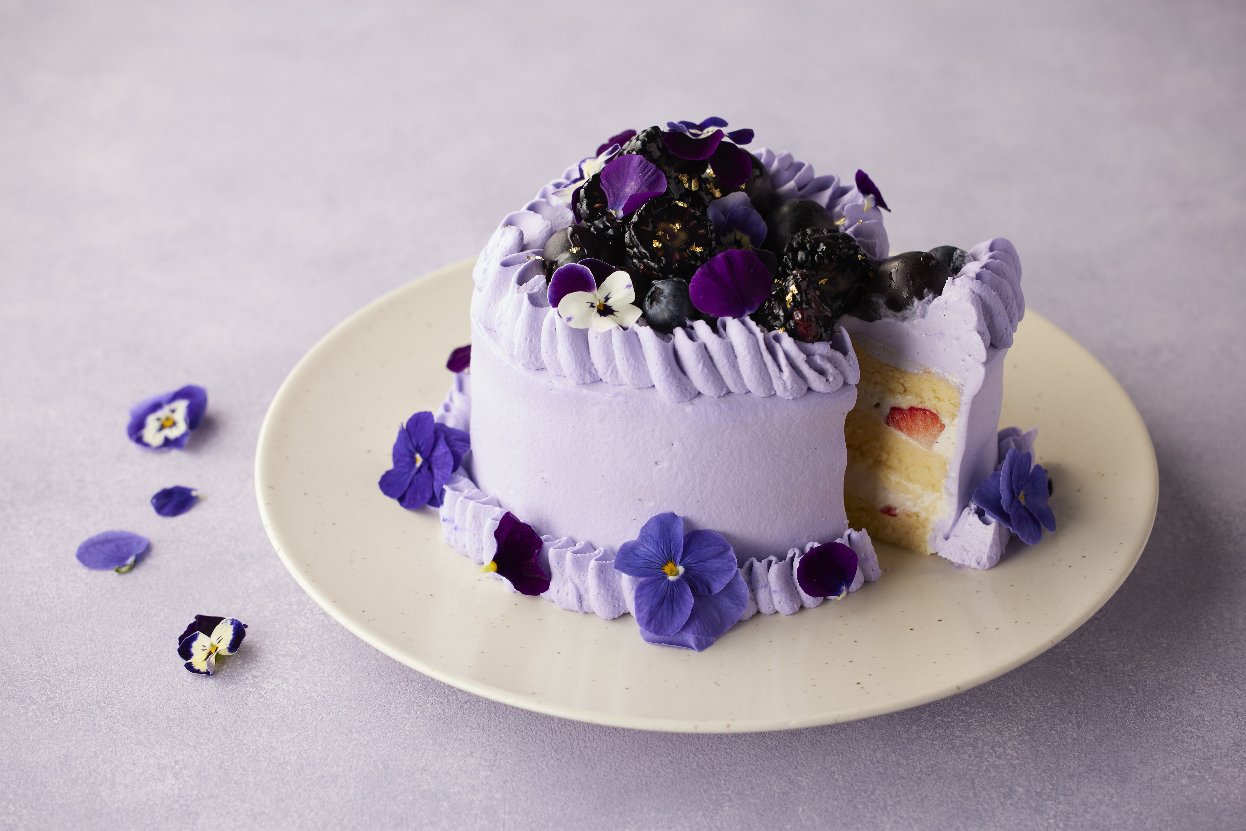オーガニックシュガーとケージフリーの卵を使用し、しっとりと焼き上げたスポンジ生地に、なめらかなホワイトチョコレートクリームと甘酸っぱい苺を重ねました。淡いパープルカラーのホイップクリームで包み込み、トップには紫色のフルーツとエディブルフラワーをあしらった、可憐な佇まいのバレンタインケーキです。